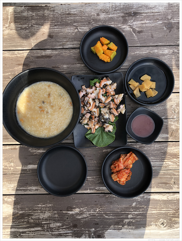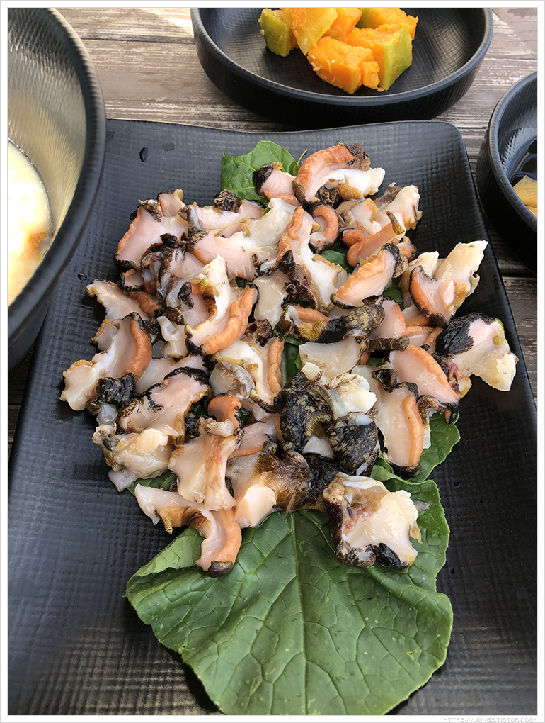 ▼ 출출한듯하여 '잠녀숨비소리'에서 성게국수나 먹어볼까 했는데 해녀분이 소라성게죽과 참소라회를 권하셔서 주문해 보았습니다. 전복도 함께 권했는데 두 메뉴만 먹기로 했습니다. 소라를 아침에 물질해서 오셨다고 싱싱하다고 권해주셨습니다. 생각했던 것 보다 맛있어서 놀랬어요. 소라성게죽은 정말 바다의 향과 맛이 그대로 나는 듯 했고 참소라회는 쫄깃하면서 약간의 단맛과 감칠맛이 올라와서 오독오독 맛 있게 먹었습니다. 인터넷에서는 유명한 맛집이였습니다.