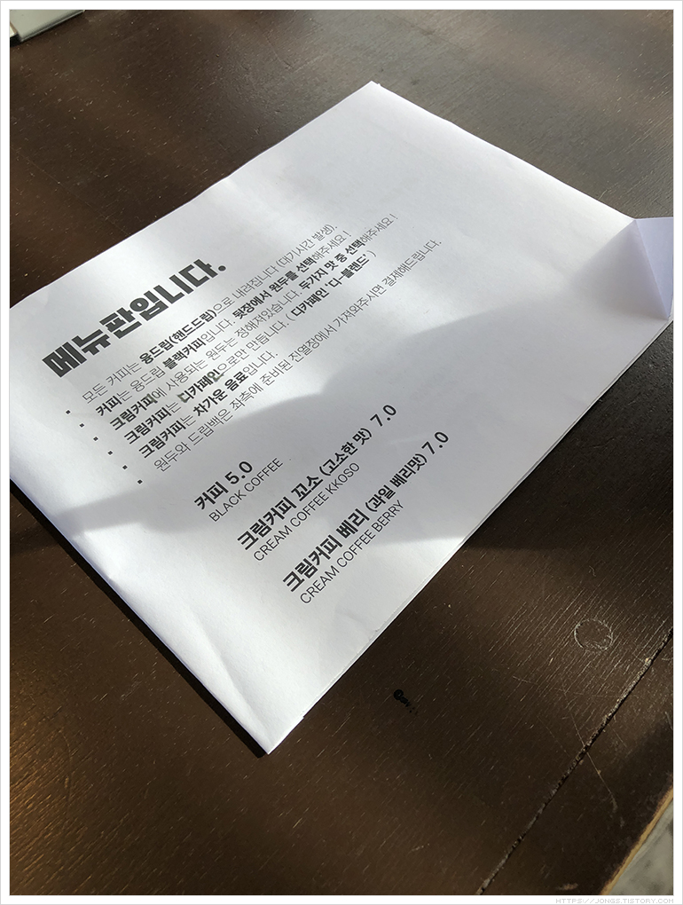 ▼ 앞 손님이 나이 지긋한 분들이셨는데 원두를 주문하셔서 얼마나 맛있으면 구매하실까라는 생각이 스쳤습니다. 약간 신뢰감이 올라가는 느낌이였습니다. 커피는 융드립으로 블랙커피와 크림커피로 크게 두 메뉴인데 융드립 커피는 뒤장에 원두를 고를 수 있습니다. 크림커피는 디카페인이고 고소한 맛과 과일 베리맛 두 종류로 단촐합니다. 크리커피 꼬소로 주문을 했어요.
