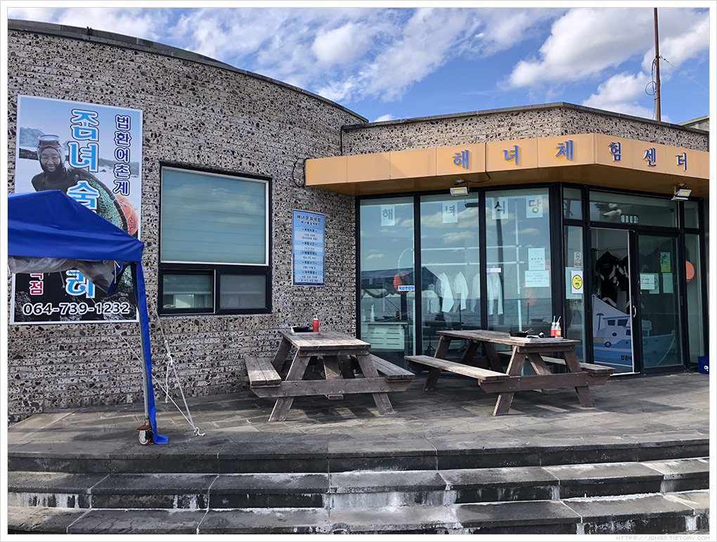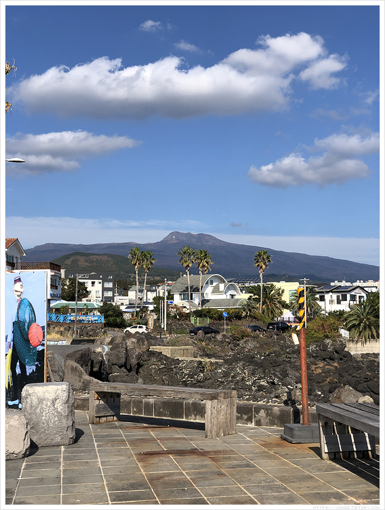 ▼ 망고홀릭 법환포구점에서 바닷가쪽으로 걸어오면 '잠녀숨비소리'라는 해녀분들이 운영하는 음식점겸 해녀체험장이 있습니다. 바닷가쪽에 의자가 있어 앉았는데 날씨가 맑으니 한라산이 바로 보이더군요.