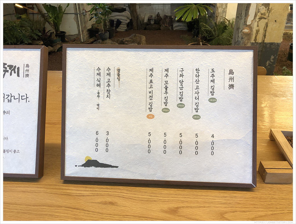 ▼ 김밥외에도 수제 고추참치와 수제식혜(백미, 녹차)가 있습니다. 제가 주문한 것은 도주제 김밥, 한라산 고사리 깁밥, 구좌 당근 김밥과 수제식혜(백미)입니다.