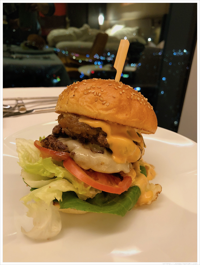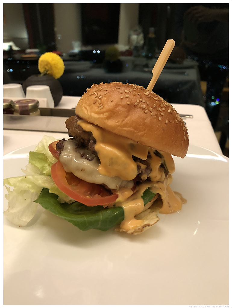▼ 저녁은 룸서비스 치즈버거(39,000원)와 불고기(39,000원)입니다. 치즈버거는 수제버거의 그런 맛이고 손으로 잡고 먹기에는 어려움이 있어 칼과 포크를 이용해서 잘라서 먹었습니다. 땅거미져 어두워지는 제주 바다를 보며 먹으니 스트레스가 확~!!! 풀렸습니다. 제주의 풍경은 참 아름답습니다.