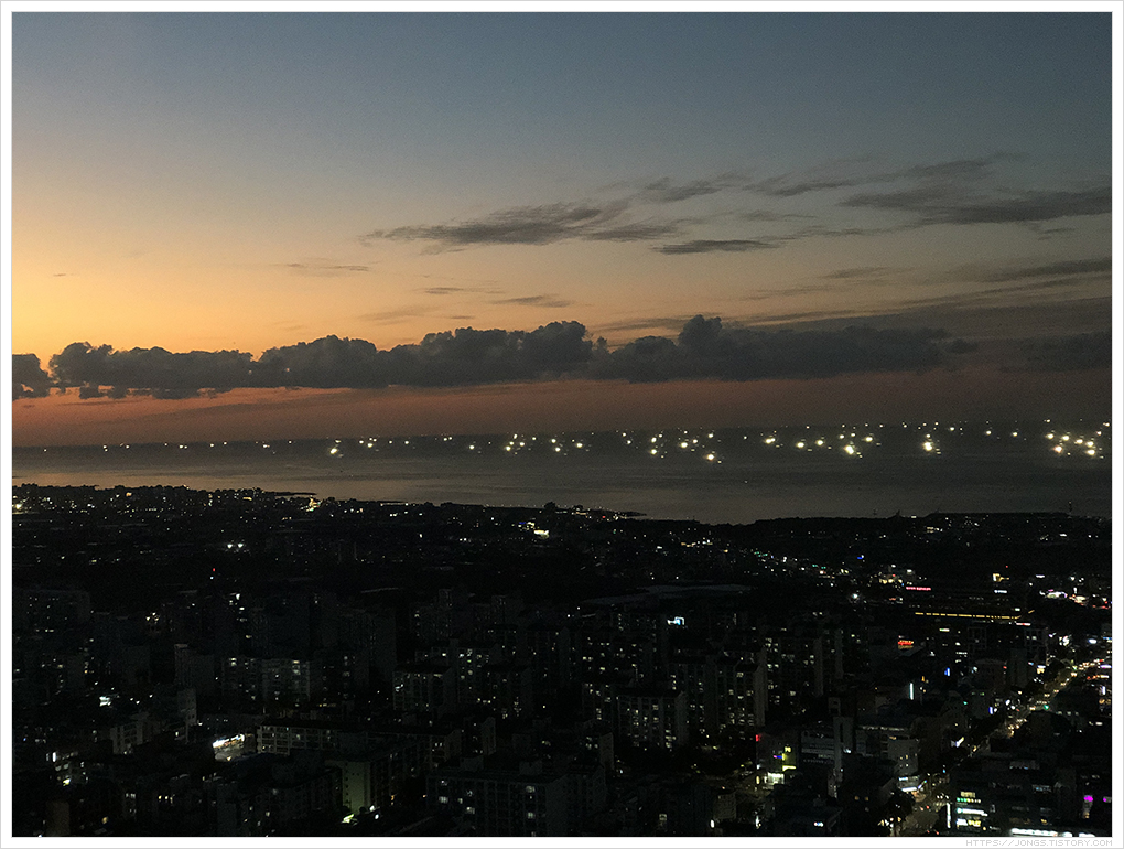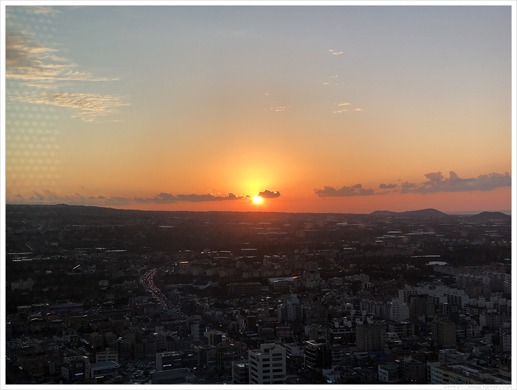 ▼ 김밥을 사서 호텔에 오니 해가 져 갑니다. 이번 제주도 여행의 날씨는 너무 좋습니다. 30층이니 해지는 것도 시원한 풍경과 함께 볼 수 있습니다. 지상층 공간과 분리된 느낌이 들어서 고층이 좋긴 하네요.
