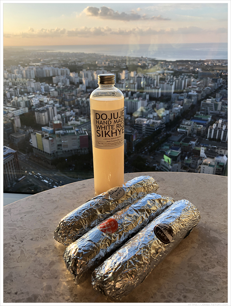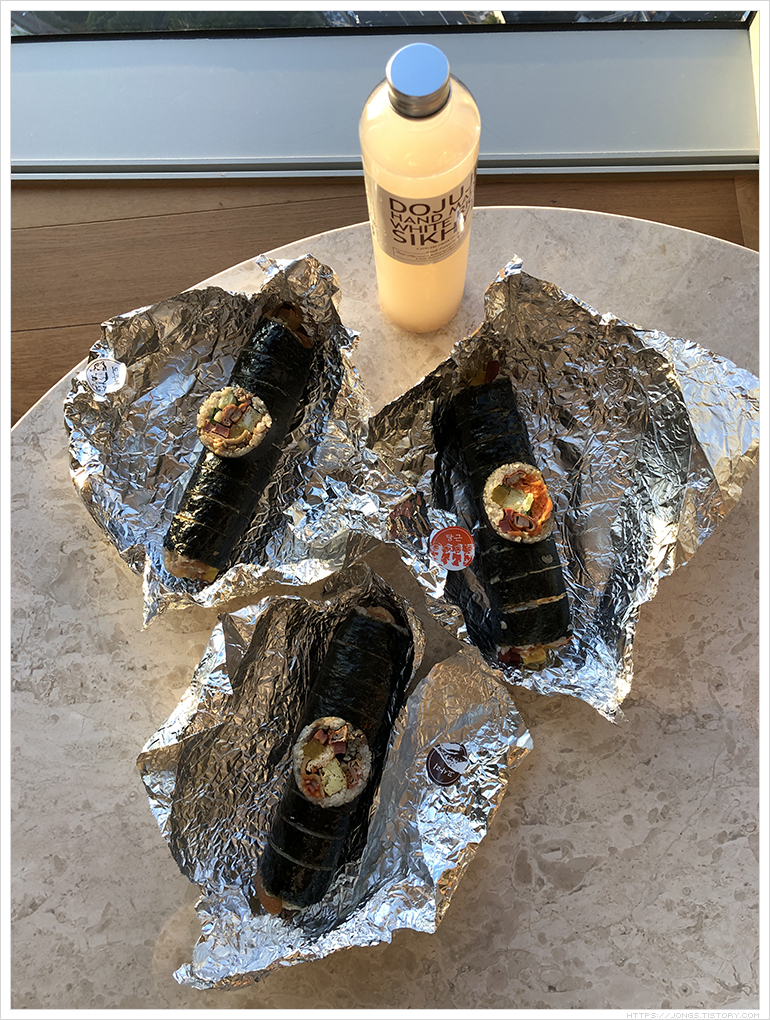 ▼ 도주제김밥에서 사온 수제식혜(백미), 도주제김밥, 한라산 고사리깁밥, 구좌당근 김밥입니다.