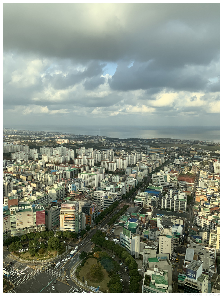 전날 낮은층에 배정된 방을 높은층으로 바꾸었습니다. 원래 계획은 첫날 방으로 하루 더 있을려고 했는데 방을 바꾸어야겠다는 생각이 들어서 짐을 싸서 나와 방을 다시 배정 받아서 오후 입실시간에 맞추어 호텔방에 들어갔습니다. 호텔 전망을 생각하고 그랜드 하얏트 제주를 예약 했거든요. 낮은 층에 있을 이유가 없는 것 같아서 바꾸습니다. 이번에는 30층에 배정이 되어서 전망도 좋고 수영장 음악소리도 들리지 않아 조용해서 좋았어요. 저층과는 전혀 다른 전망를 보여 줍니다. 저층에서 건물들이 가깝게 보였던 것과는 다르게 먼 느낌이 들고 훨씬 아래쪽에 있다는 느낌이 듭니다.