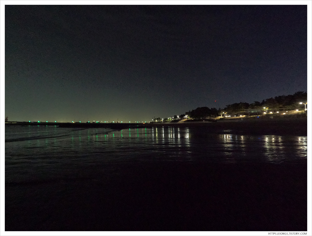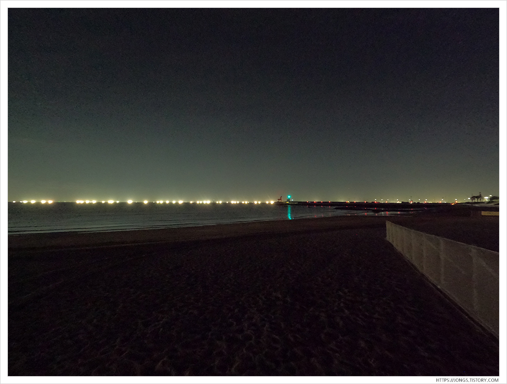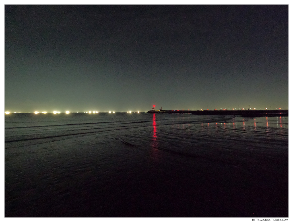 ▼ 멀리 고기잡이 배의 불빛이 장관이죠. 날씨가 좋아 파도도 거의 없어 조업하기에 최적인 것 같습니다. 파도가 거의 없다 보니 물가쪽 가까이에서 살랑살랑 오는 파도소리를 들을 수 있어 좋습니다.