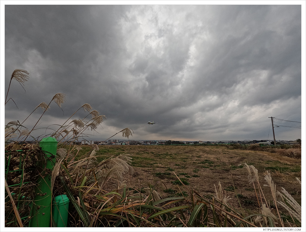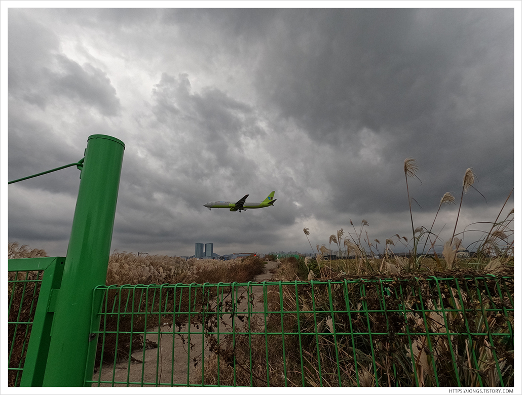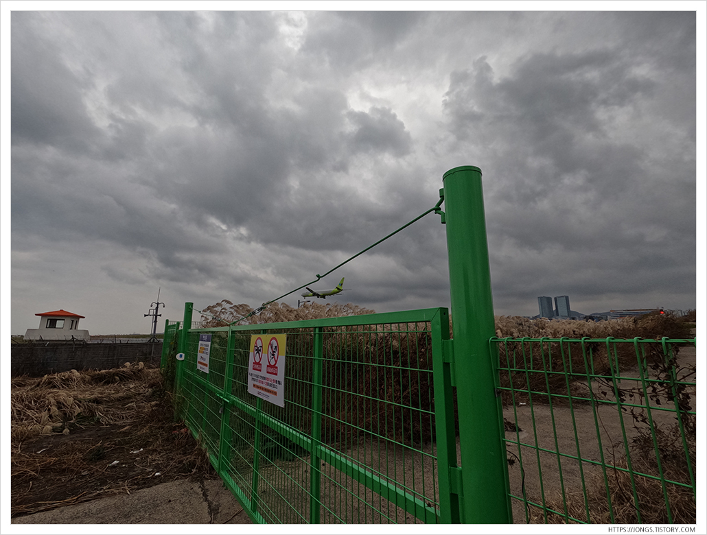 ▼ 그라나다 카페 옆에 있는 작은 길인데 지금은 항공기 안전을 위해 막아 놓았습니다. 막힌다는 이야기는 인스타그램을 통해 접하긴 했는데 비행기를 좋아하는 사람으로써 조금 더 가까이서 볼 수 없는 것은 아쉽더라구요. 막힌 이유가 아마 밤에 불꽃놀이를 하며 사진을 촬영하니 비행기 조종석에서는 항공기 착륙등과 착각할 수도 있고 여러 안전 문제가 발생하긴 하겠더라구요. 여하튼 옆에서 내리는 비행기를 잠시 구경했습니다. 어제 날씨와는 다르게 아침에는 구름이 가득하죠.