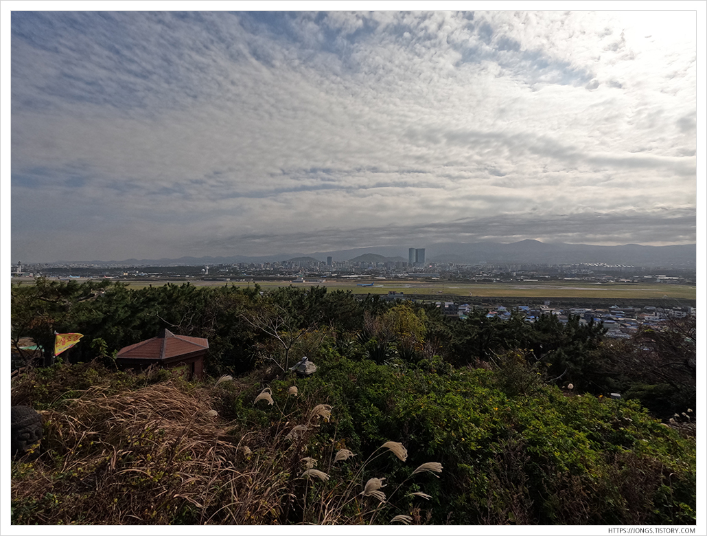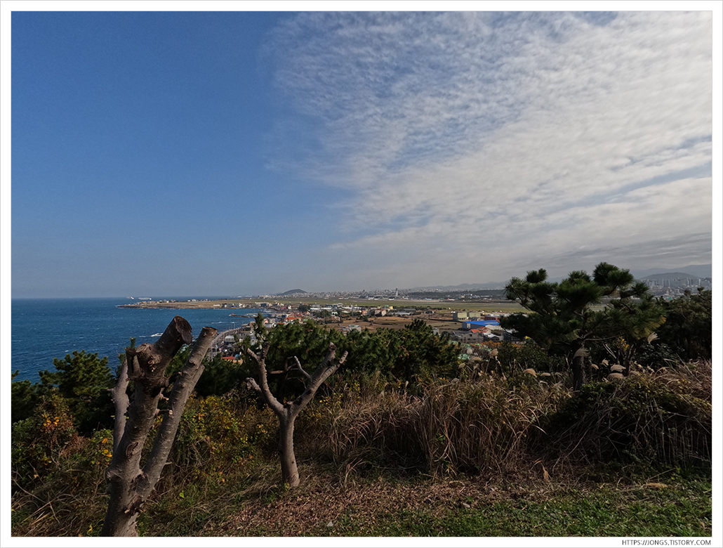 ▼ 다음날에는 도두항에 왔습니다. 언덕처럼 있는 것이 도두봉입니다. 제주공항 끝부분에 비행기를 가까이 볼 수 있는 곳이 있다하여 무료 주차장에 주차를 했습니다.