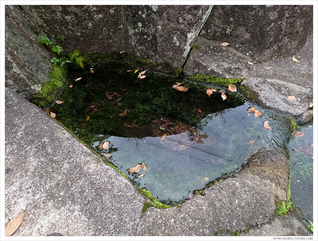 ▼ 우물처럼 되어 있는데 윗쪽이 덮혀 있습니다. 그 옆으로 구멍이 있는지 물이 솟아 올라오는데 쫄쫄쫄 개울처럼 흘러서 내려가는 3단 구성으로 되어 있습니다.