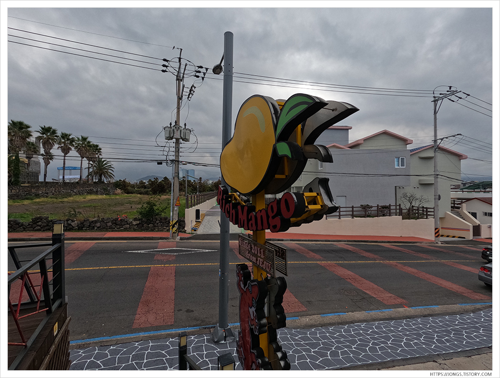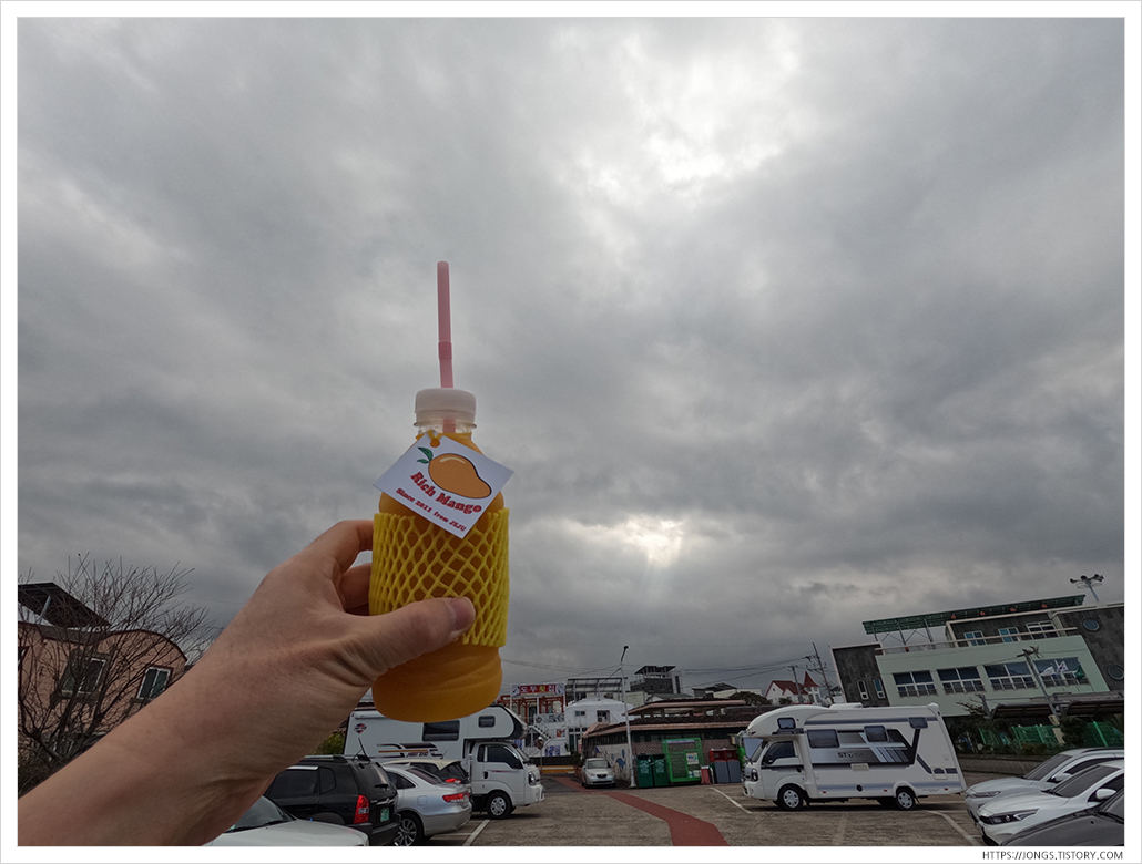 약천사를 둘러보고 나서 목이 말라 음료를 먹기 위해 법환포구에 있는 망고홀릭에 갔습니다. 망고홀릭에서는 애플망고쉐이크(7,000원) 한잔 했습니다. 겨울인데도 불구하고 날씨가 따뜻한편이라