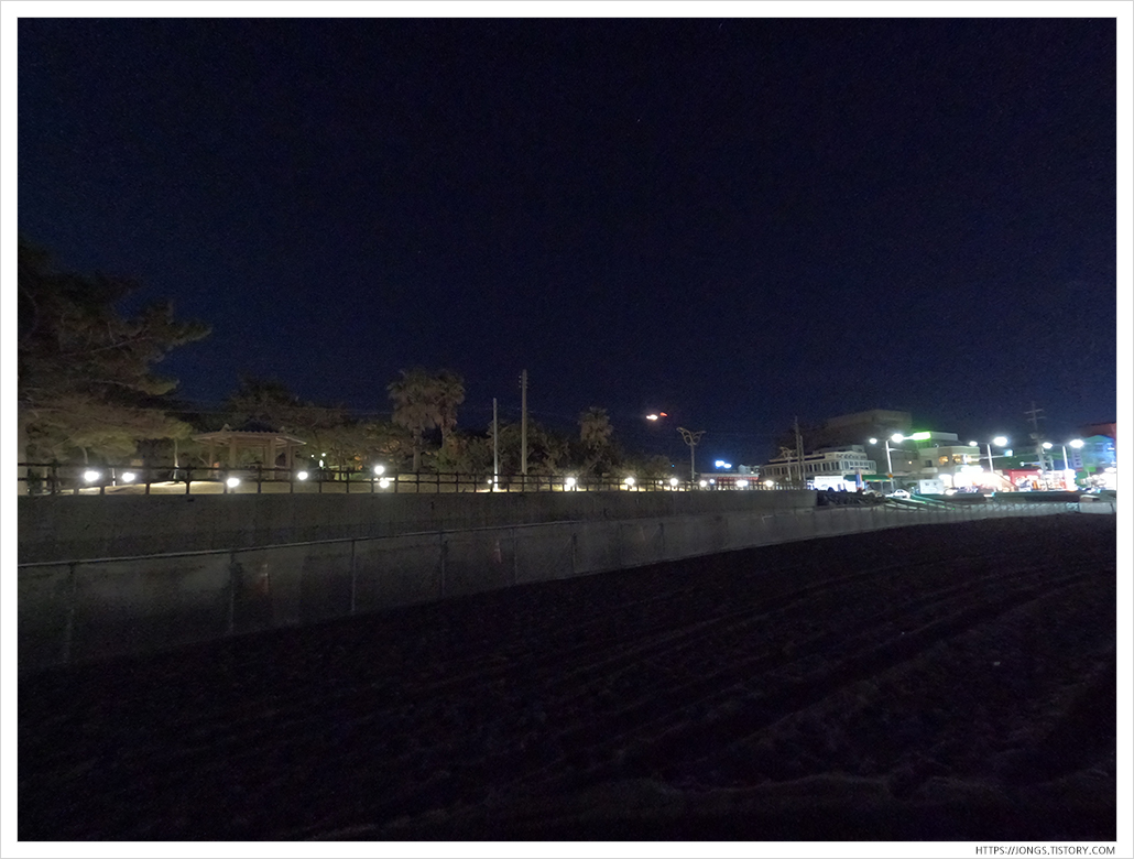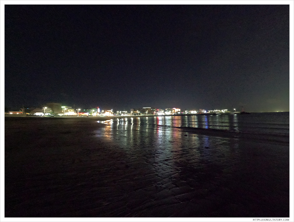▼ 해지고 사람이 거의 없을 때 온 것은 처음인 것 같습니다. 비행기 불빛과 멀리 해변 상점의 불빛이 장관이네요. 물이 많이 빠진 상태였습니다. 해변 모래사장에는 불빛 없이 깜깜해서 사람이 거의 없습니다. 드문드문 있는데 어두워서 옆에 오면 깜짝깜짝 놀랍니다.
