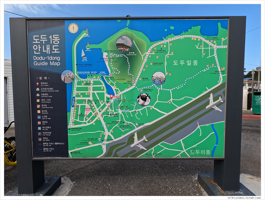 ▼ 안내도에 나와 있는 것과 같이 도두항 옆에 도두봉이 있고 이 오름에 오르면 제주공항이 한눈에 들어오는 전망지입니다.