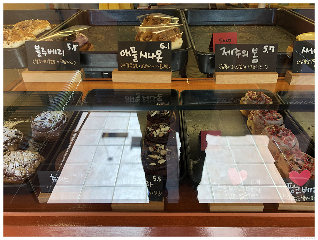 ▼ 시나몬롤 종류가 이렇게 많을줄은 모르고 왔는데 고르는 데 고민이 되면서 시간도 조금 걸렸어요. 시나몬롤의 오리지날인 클래식(4,700원)과 써니레몬(5,500원)을 구입했습니다. 제주의 봄, 스트로베리머치는 벌써 재고가 없었습니다. 시간이 12시 30분쯤이였는데 꽤 많이 팔려서 놀랬어요.