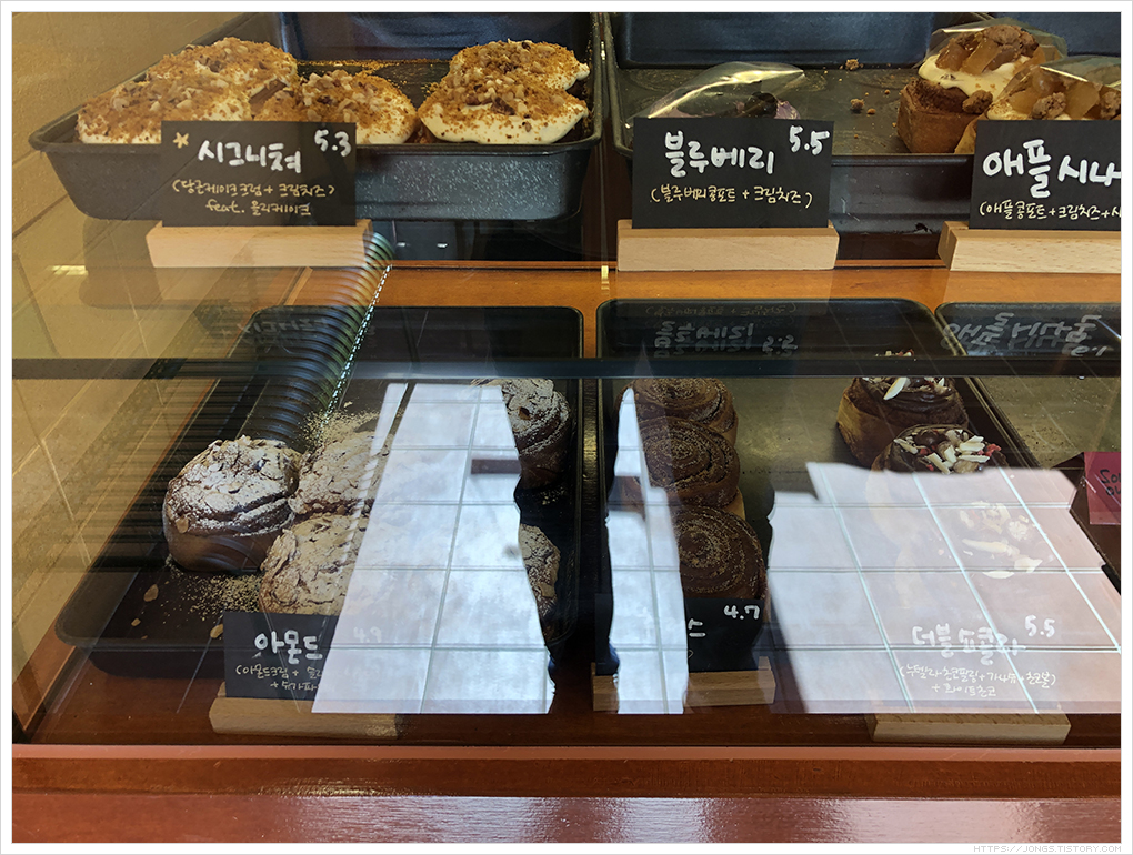 ▼ 올리롤리에 들어가니 주인분이 나오셨고 메뉴를 보면서 고르는 동안 기다려 주셨습니다. 휘낭시에 시나몬롤, 바나나푸딩 등이 있는데 각 메뉴들 중에는 다양한 맛으로 나누어지기도 합니다.