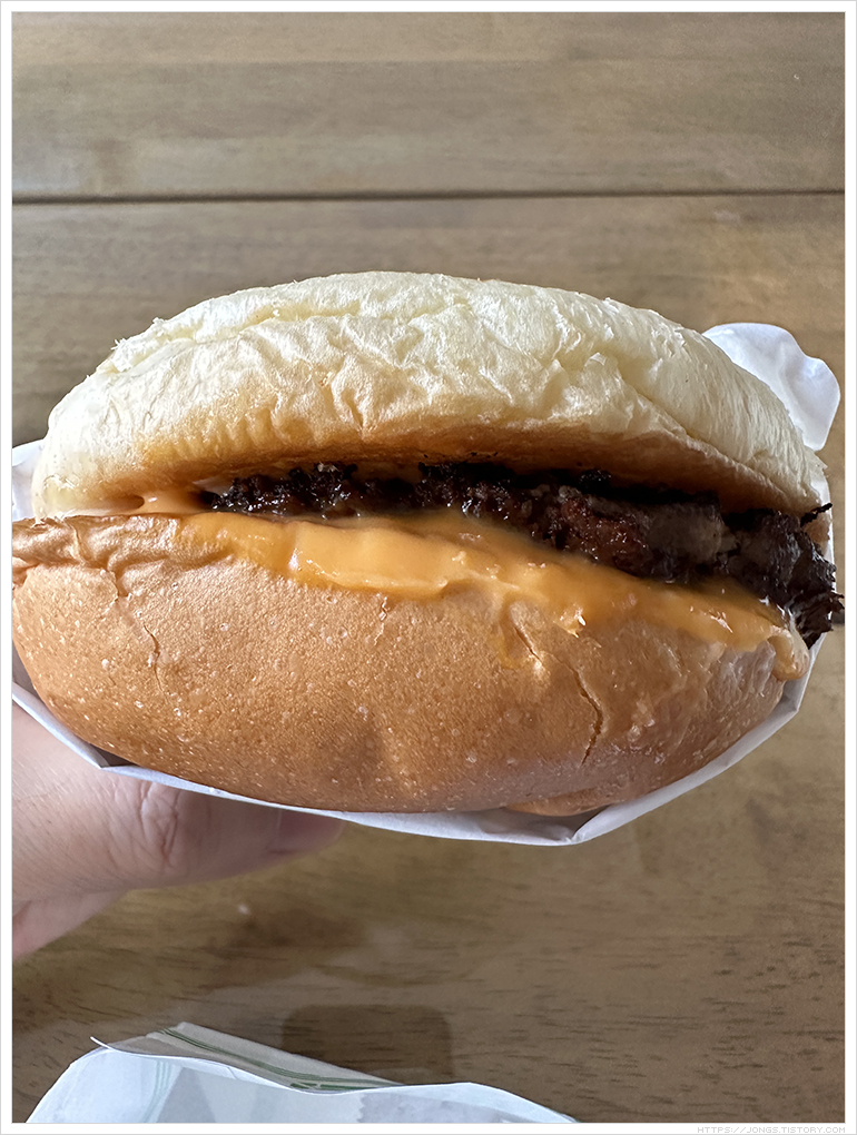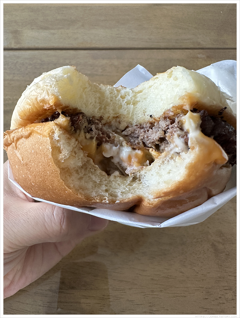 ▼ 역시 빵이 부드럽습니다. 브리오슈번이 정말 마음에 듭니다. 개인적으로 브리오슈 좋아하거든요. ^^ 고기도 퍽퍽하지 않고 촉촉하고 부드러우며 치즈와 마요네즈가 어우러져 맛있습니다. 채소는 없지만 볶은 것인지 삶은 것인지는 모르겠지만 양파가 들어 있었고 미국 스타일의 수제버거의 감성을 느낄 수 있어요. 고기를 좋아하다 보니 채소가 없어 느끼할 줄 알았는데 고기의 풍부한 맛을 더욱 진하게 느낄 수 있어 좋았습니다.