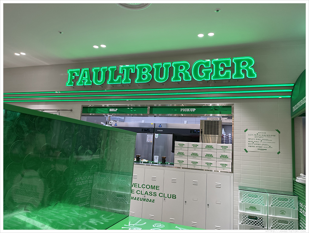 ▼ 폴트버거(FAULTBURGER) 매장은 흰색에 초록색이 포인트가 됩니다. 원산지 표시 종이를 붙인 테이프도 녹색이네요. 잘 어울립니다. 폴트버거에 대해 찾아보니 테니스 코트와 관중석 컨셉이라고 나옵니다. 폴트가 테니스에서 사용하는 용어라고 하던데요. '서브에 관련된 규칙을 위반하는 것'의 의미가 있는 것 같습니다. 보통의 햄버거들의 규칙을 깨뜨리겠다는 의지가 담긴 이름인 것 같습니다. 오픈한지 얼마안된 따끈따끈한 곳이라 그런지 사람이 없었습니다.