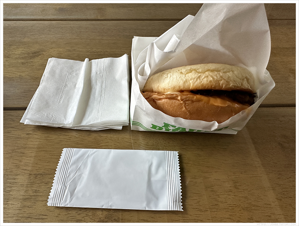 ▼ 햄버거빵이 부드러워보여요. 치즈가 살짝 나와 있고 햄버거 패티도 눈에 들어오는데 상추나 토마토나 채소가 없습니다. 포장의 구성품은 메인 햄버거와 티슈, 물티슈로 구성이 되어 있습니다. 물티슈를 주는 것이 프렌차이즈 스타일과는 다른 조금 더 가격대가 있는 수제 햄버거의 느낌을 추가해 주는 것 같습니다.