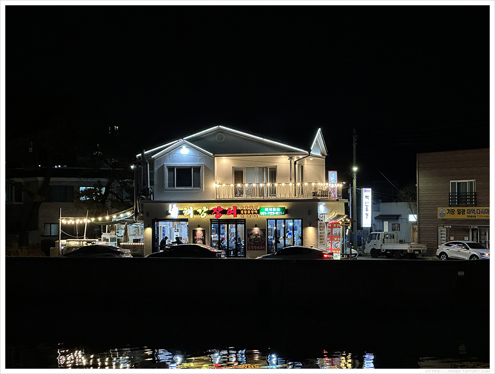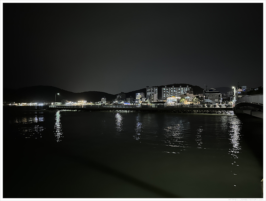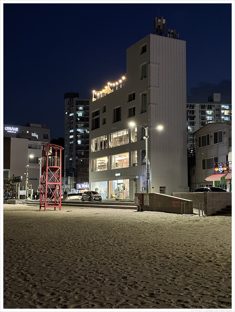 ▼ 포장 주문 후 15~20분 정도 걸린다고 해서 일광해수욕장 여기저기를 구경해 봅니다. 파도가 살짝 있었습니다. 비가 와서 그런지 바다 내음이 진하게 느껴졌고 참 좋더군요. 그리고 비가 와서 바닷물은 탁했습니다. 일광 주변으로 카페가 참 많이 생긴 것 같아요. 카페 불빛이 주변을 감싸고 있습니다.
