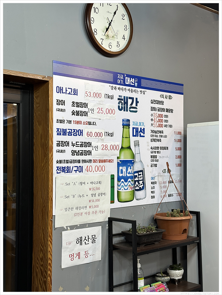 ▼ 메뉴는 곰장어 종류, 장어종류로 크게 나눌 수 있습니다. 첫 주에는 양념공장어를 주문 했고, 둘째 셋째주에는 곰장어와 함께 양념장어, 숯불장어와 전복죽까지 주문을 했습니다. 낮에는 식사를 하기 위한 손님이, 밤에는 술마시기 위한 손님이 오는 느낌입니다. 그리고 전복회/구이/전복죽도 있고 성게전복죽, 장어와 곰장어 매운탕, 십전대보탕도 있습니다. 세트메뉴도 구성되어 있고 해장라면도 있어요. 2인 이상 주문 가능한 것도 있어 잘 확인하셔야 합니다. 그리고 초벌은 15분 정도 시간이 걸리니 여유롭게 생각하고 오시면 좋습니다.