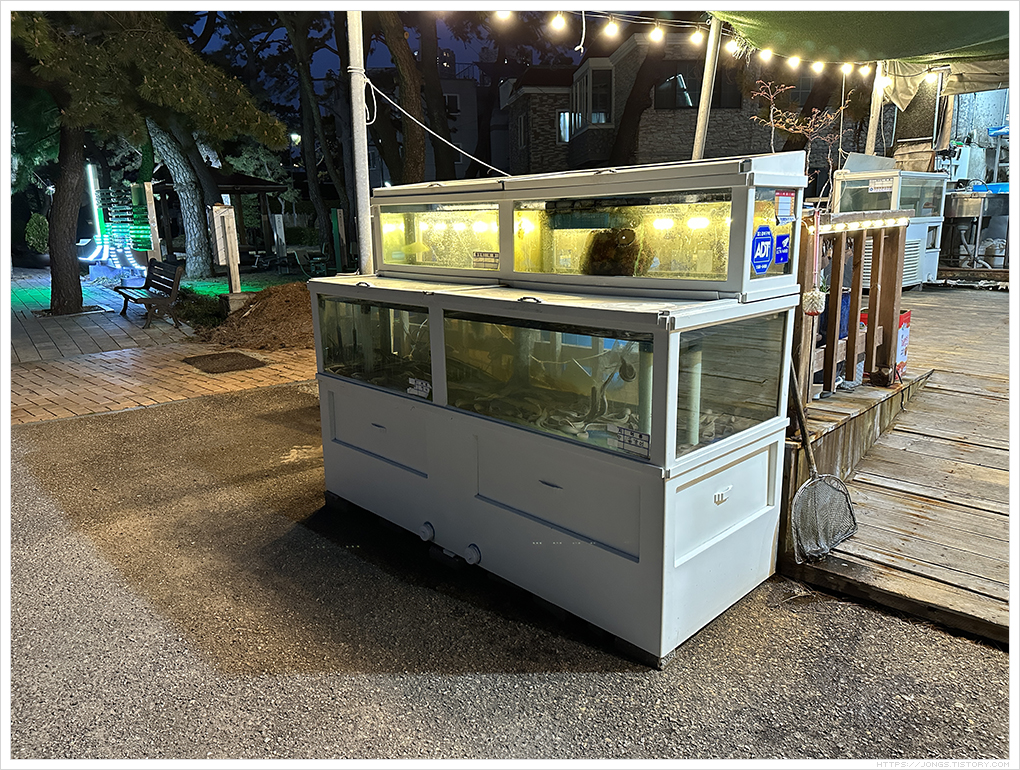 ▼ 장어와 곰장어가 들어 있는 수조입니다.