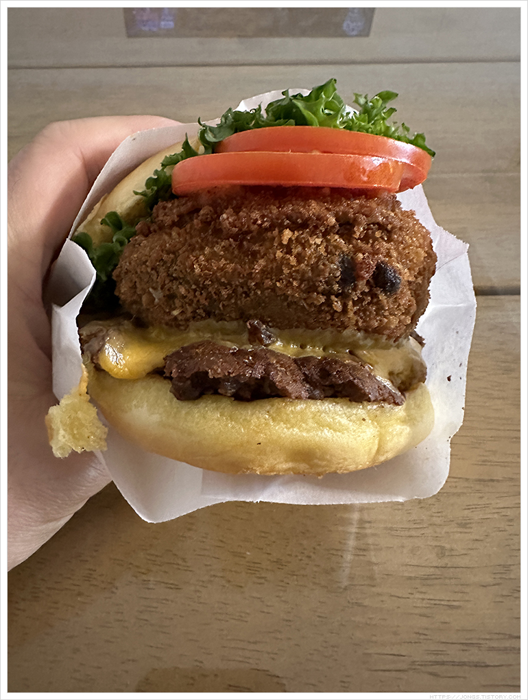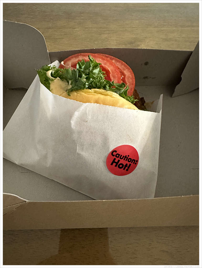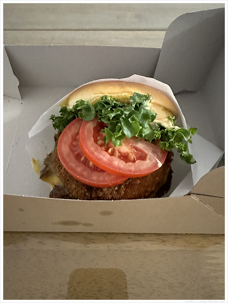 ▼ 햄버거 크기가 큰 느낌입니다. 상추?, 토마토 2조각, 패티는 버섯과 고기가 함께 하나로 된 형태고 고기맛이 나는데 버섯의 식감이 더 크게 다가오는 패티입니다. 그리고 쉐이크쉑 포스팅한 것 보면 짜다는 말이 많았는데 맞더군요. 네~ 짭짤합니다. 미국에서 음식 먹을 때 너무 짭짤해서 힘들었는데 그런 느낌이 나더군요.