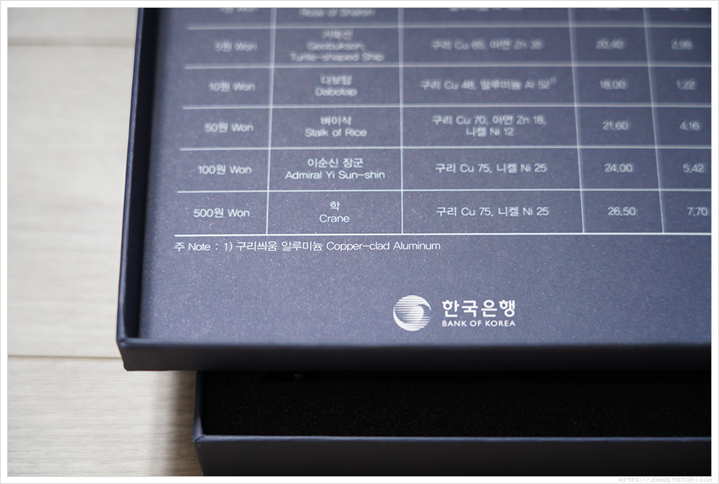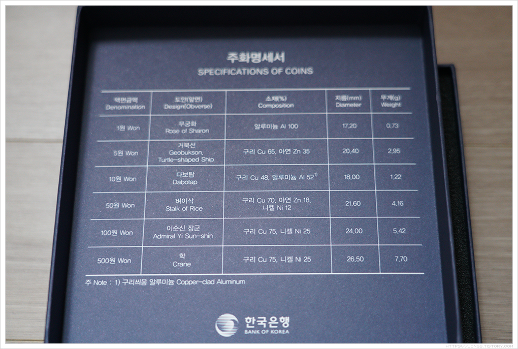 ▼ 윗뚜껑 안쪽에는 주화명세서가 있습니다. 동전의 액면금액, 도안(앞), 동전 재료, 지름, 무게가 나와 있습니다. 10원은 구리씌움 알루미늄입니다.