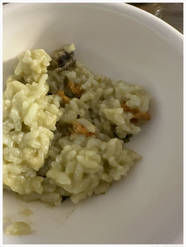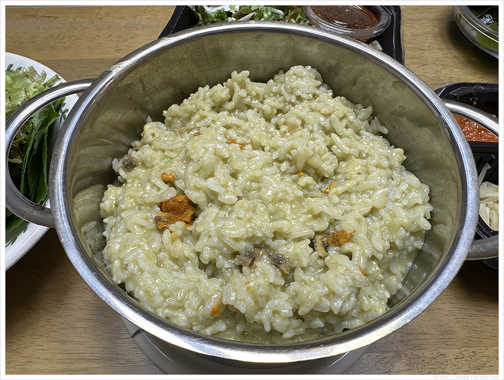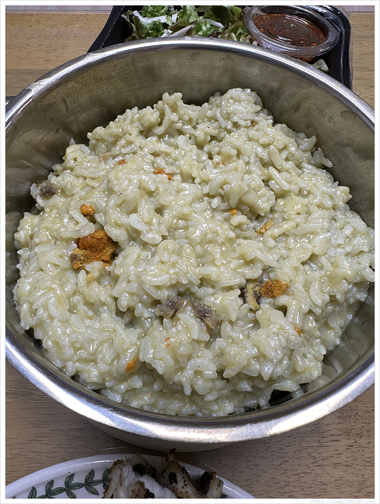 ▼ 사장님 찬스로 궁금해 했었던 성게 전복죽을 먹어보게 되었습니다. 군데군데 성게알이 보입니다.