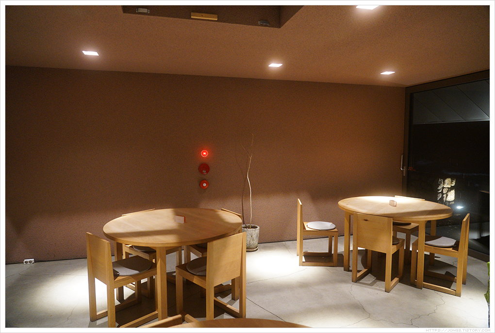 ▼ 입구입니다. 여기는 4명씩 앉을 수 있는 둥근 탁자 4개가 있어요.
