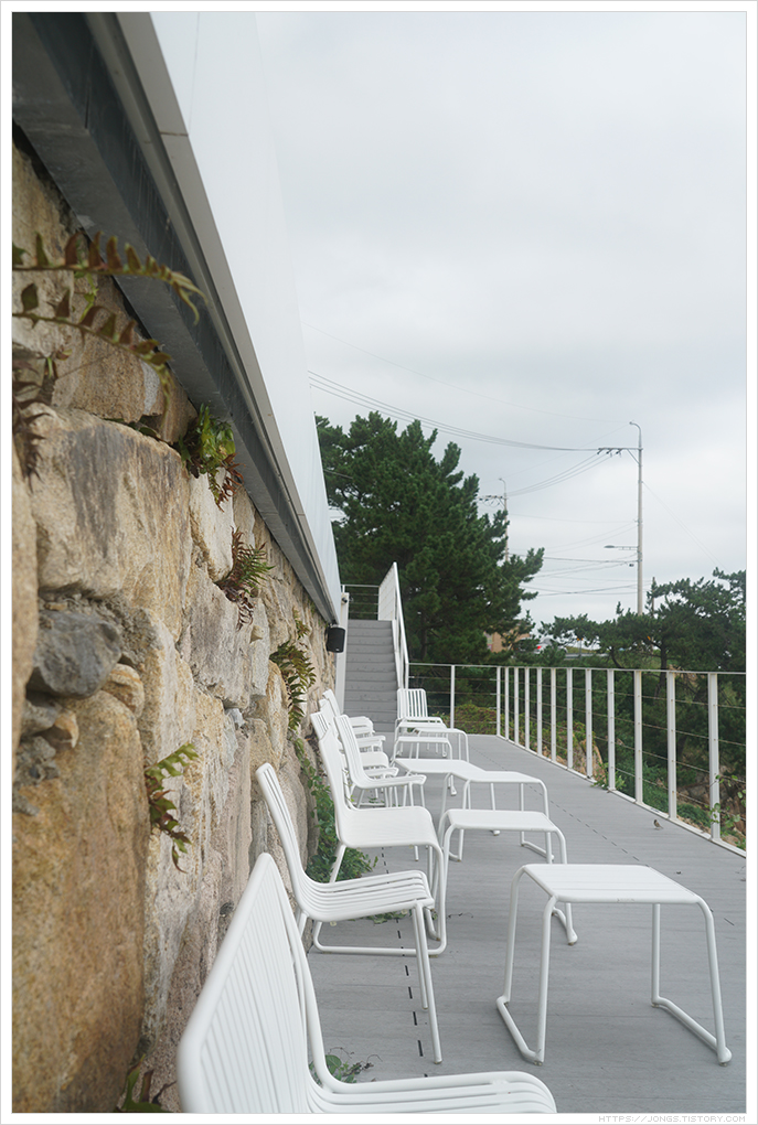 ▼ 태풍이 올라와서 인지 날씨가 그렇게 덥지 않아 외부 테이블로 옮겼습니다. 주문 받는 건물 앞으로 계단을 따라 내려오면 테라스 형태로 되어 있고 바다 앞에 앉아 온전히 바다를 느낄 수 있죠. 이 곳은 후덥한 더위와 습도, 파도소리, 새소리 등을 기장 바다를 보며 느낄 수 있는 곳입니다. 선호도에 따라 장소를 선택하면 되고 여름이라 이 자리 인기가 없었어요. 봄, 가을에는 카페 내부보다 인기가 좋습니다.