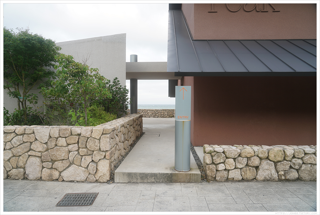 ▼ 이 곳도 포토존 중의 하나이고 가장 인기 있는 곳이 바다가 보이는 저 돌담입니다. 가장 인기가 좋고 많이 촬영을 하는 곳이죠. 들어가서 둥근 기둥쪽 건물에서 주문과 만들어진 메뉴를 받아서 올 수 있습니다. 그런데 여기 바다 풍경이 정말 예술입니다. 일하시는 분들 정말 좋을 것 같아요. 그리고 오른쪽으로 들어가면 카페 내부가 나오는데 세련된 구조를 가지고 있습니다.