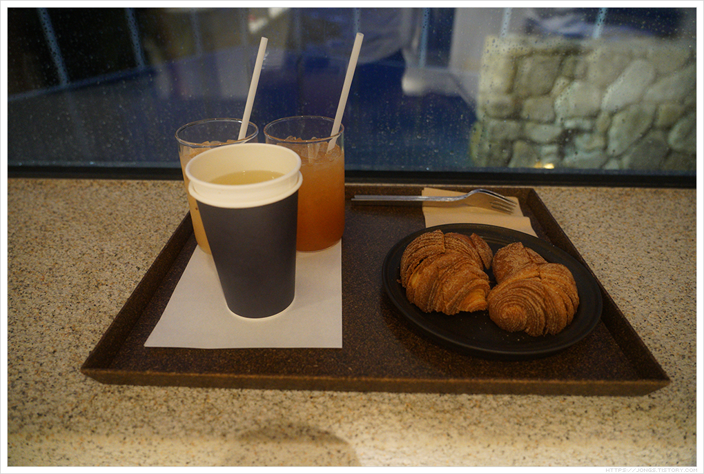 ▼ 레몬진저티(HOT, 7,000원/1개), 로열밀크티(7,000원/1개), 자두주스(8,000원/1개), 시나핀 1개(5,000원/1개)입니다. 자두주스를 먹었는데 생자두의 맛에 설탕이 조금 섞인 듯 한데 정말 맛 있습니다. 예전에 자두주스 정말 맛 있었던 생각이 납니다.