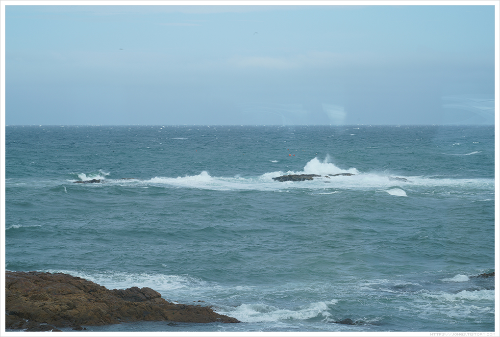 ▼ 주문하는 공간에서 본 바닷가 창문입니다. 일하시는 분들 많이 바쁘겠지만 바위에 부서지는 파도를 보는 것만으로도 힐링이 될 것 같아요.
