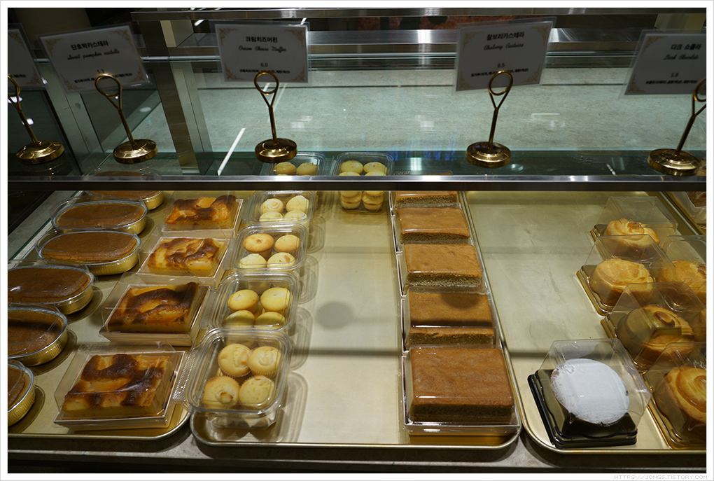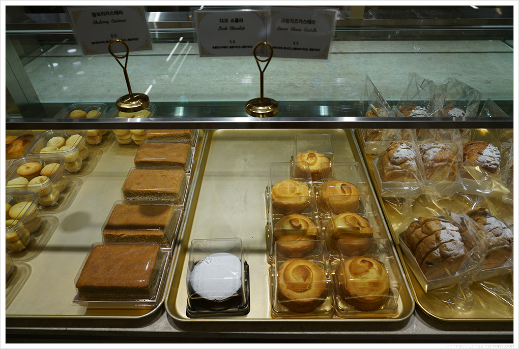▼ 손님이 많이 다녀 갔는지 남은 메뉴가 몇개 없습니다. 왼쪽부터 허니카스테라, 단호박카스테라, 크림치즈머핀, 찰보리 카스테라입니다.