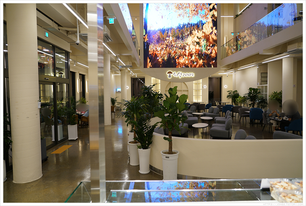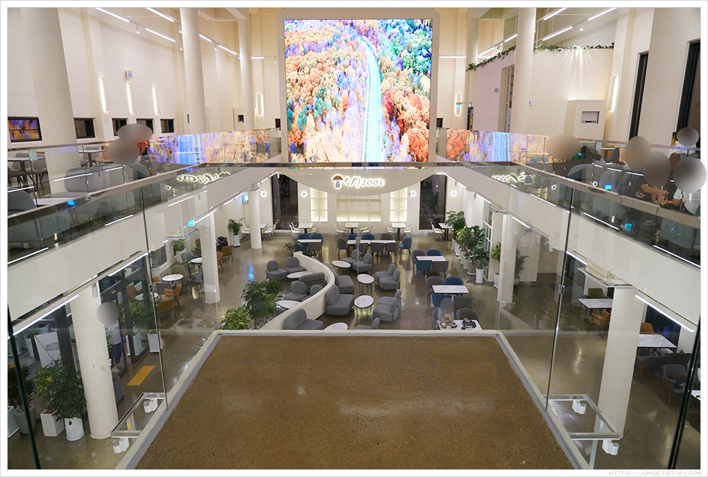 ▼ 1층 보다는 2층에 사람들이 많이 있습니다. 2층은 창가쪽으로 좌석이 있고 가운데가 비어 있는 구조로 되어 있습니다. 높이가 상당히 높고 교회 내부 느낌이 나는 것 같기도 해요.