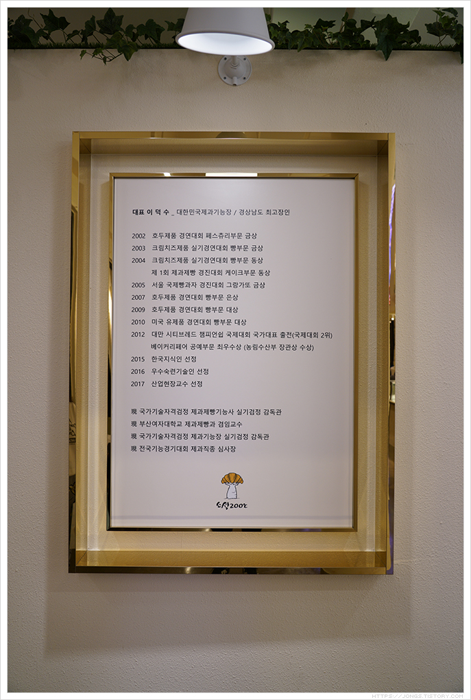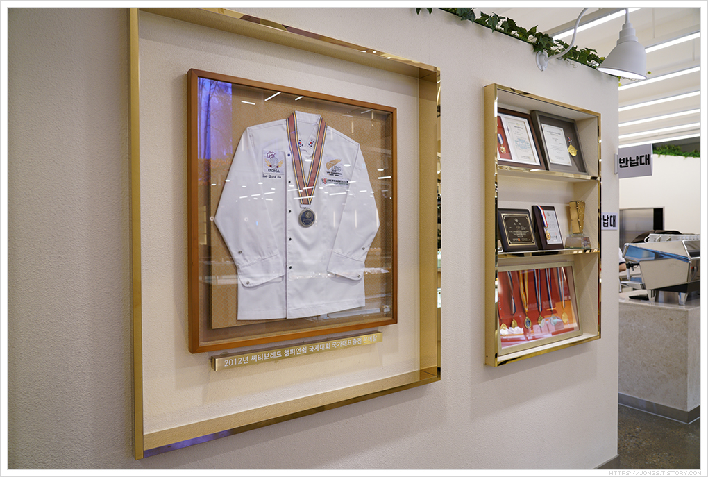 ▼ 이덕수 명장님 2012년 씨티브레드 챔피언쉽 국제대회 국가대표 출전 은메달이라고 합니다. 각종 상패와 기능장 회원증도 있어요. 경력을 소개하는 액자도 있습니다.