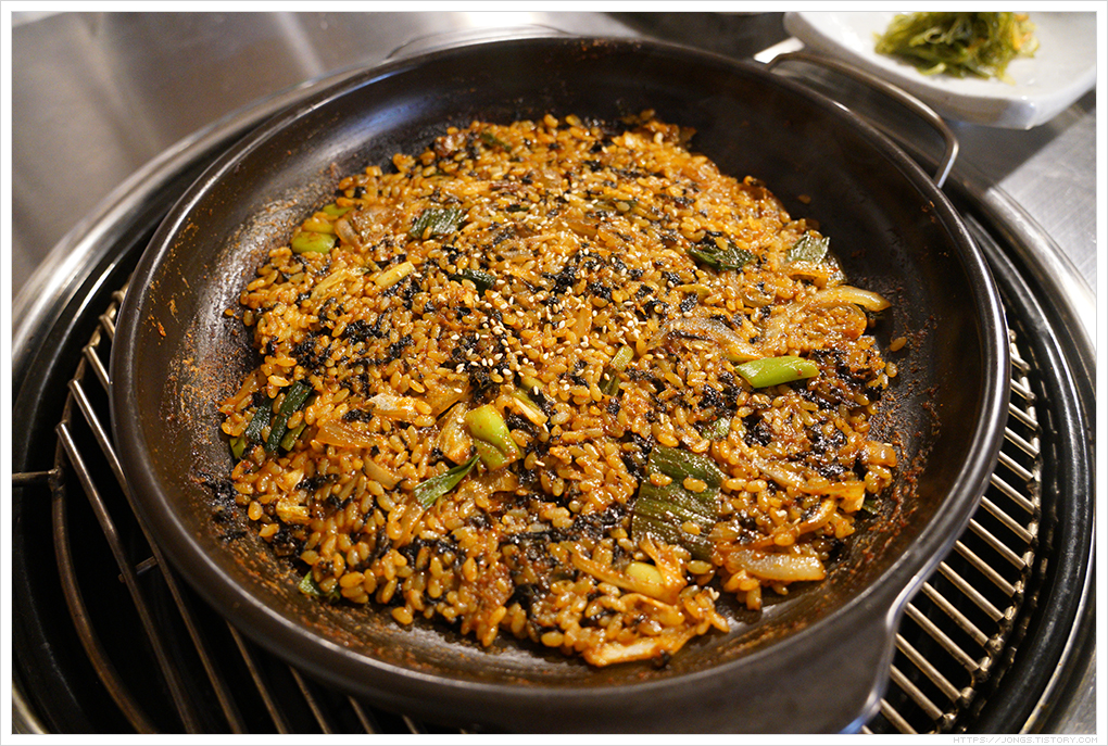 ▼ 양념 곰장어를 쌈에 한참 싸먹고 볶음밥 1개를 주문했습니다. 늦은 시간이라 1개만 볶았습니다. 볶음밥도 주방에서 조리해서 가지고 왔습니다. 양념이 맛있으니 볶음밥도 예술이네요.