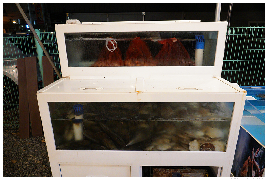 ▼ 조개구이용 재료를 보관하는 수조입니다. 재료가 많이 없는 것 같지만 옆 수조에 많은 양의 조개가 가득합니다.