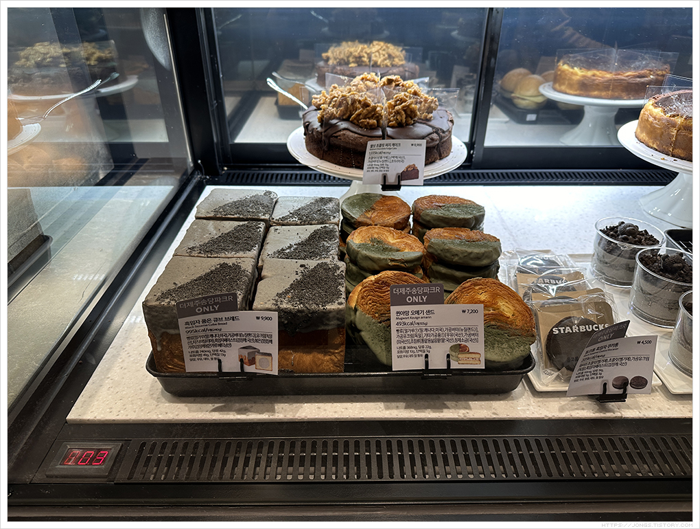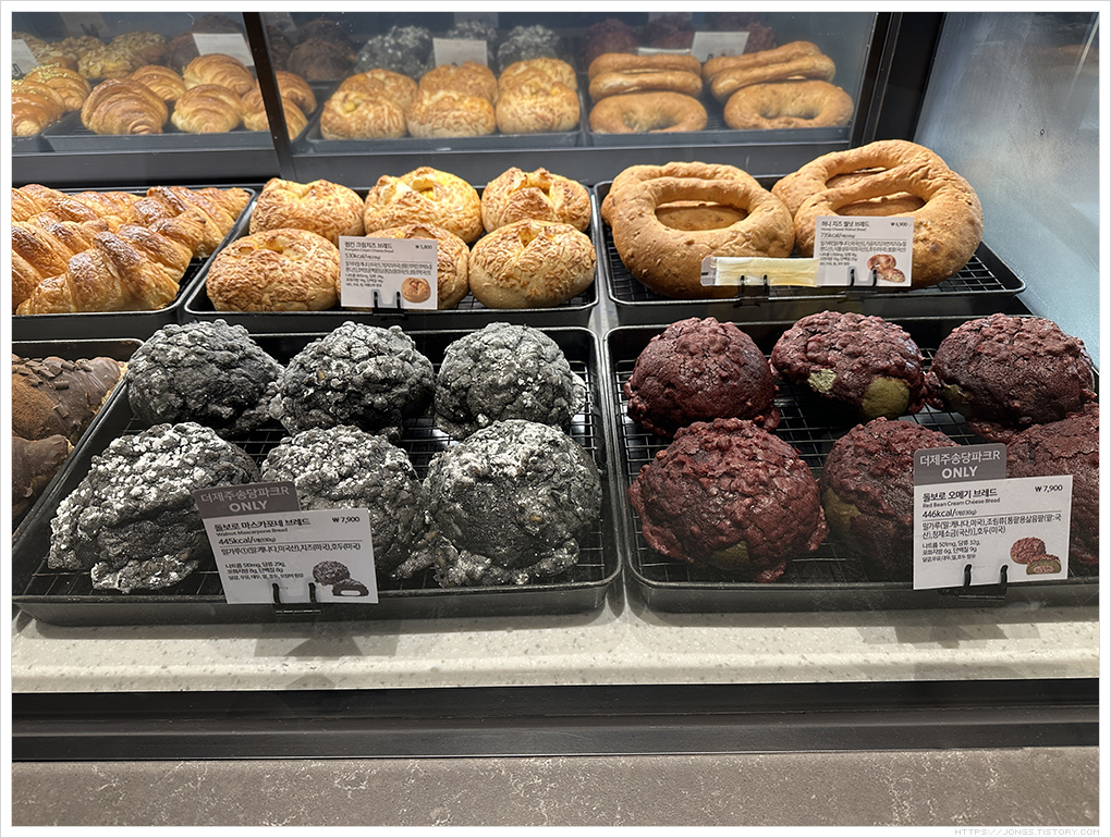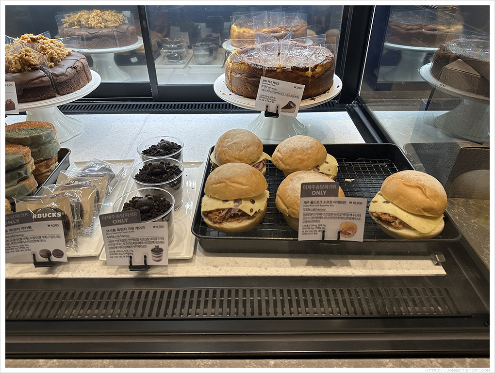 ▼ 번트 치즈 케이크(7,500원), 제주 풀드포크 소프트 바게트번(10,900원, 더제주송당파크R 전용메뉴), 코시롱 흑임자 크림 케이크(8,500원, 더제주송당파크R 전용메뉴)