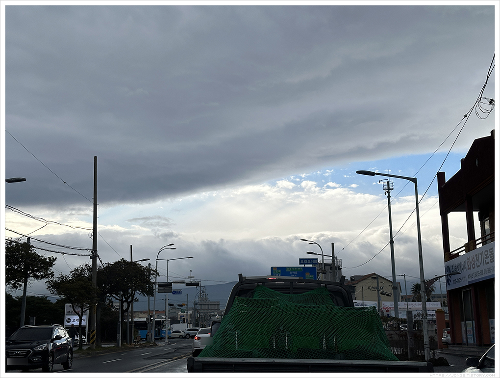 ▼ 동쪽송당 동화마을로 출발하려고 하니 비구름이 걷히는 느낌이 들었습니다. 구름의 경계선에 있는 느낌입니다. 한라산쪽에 맑은 하늘이 살짝 얼굴을 내밀어 주네요.