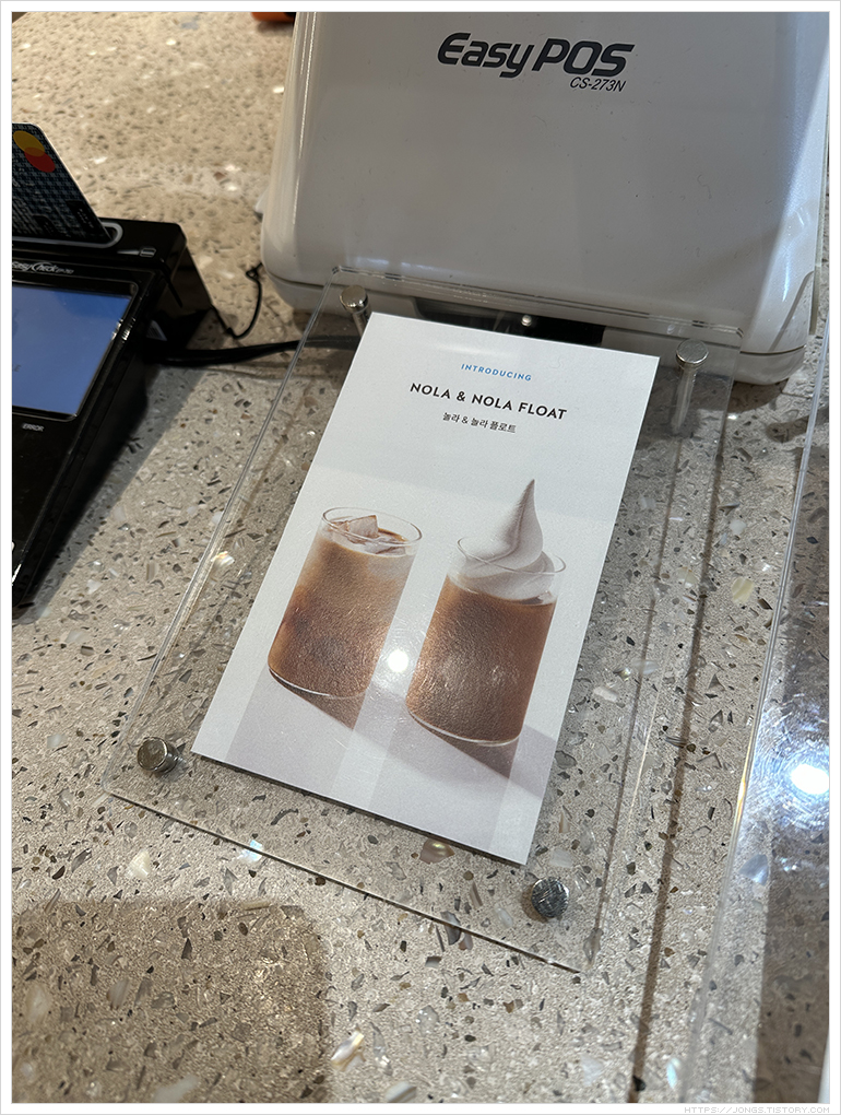 ▼ 놀라 플로토입니다. 놀라(NOLA, 콜드브루에 유기농 설탕과 유기농 우유를 넣은 메뉴)라는 메뉴에 유기농 아이스크림을 올린 메뉴입니다.