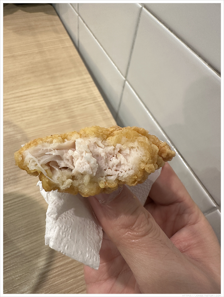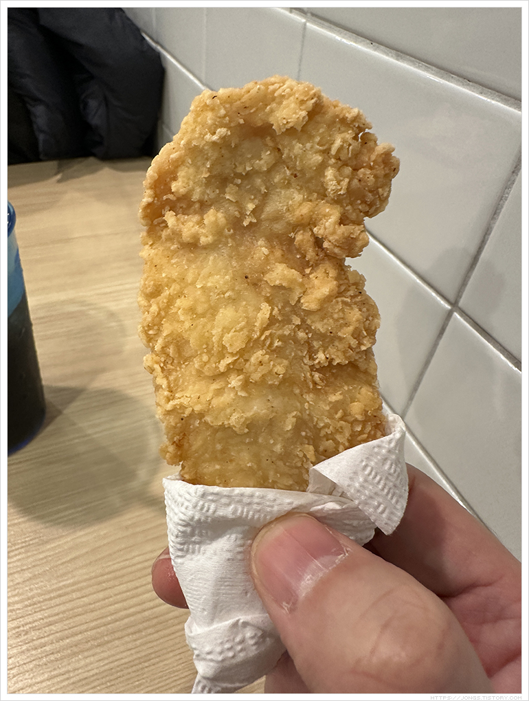 ▼ 돌하르방팩에 함께 나오는 휠레 2조각입니다. 기름을 자주 갈아서 쓰는지 기름지지 않고 맛이 깔끔합니다. 바로 튀겨서 주는지 뜨끈뜨근하구요. 후추 맵싸한 맛이 잘 느껴지고 치킨순살이라 부드럽습니다.