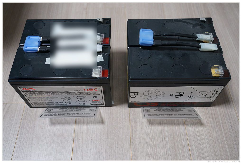 ▼ 배터리에 연결된 붉은선, 검은선을 분리하고 배터리를 꺼내면 됩니다. 왼쪽이 새 배터리, 오른쪽이 헌 배터리입니다.