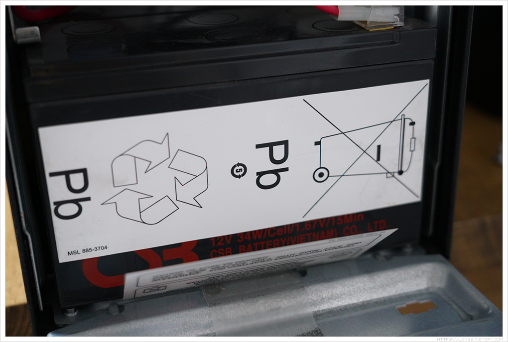 ▼ 배터리 박스를 열어 보면 설명서 등과 함께 납배터리가 들어 있습니다. 상당히 무거워요.