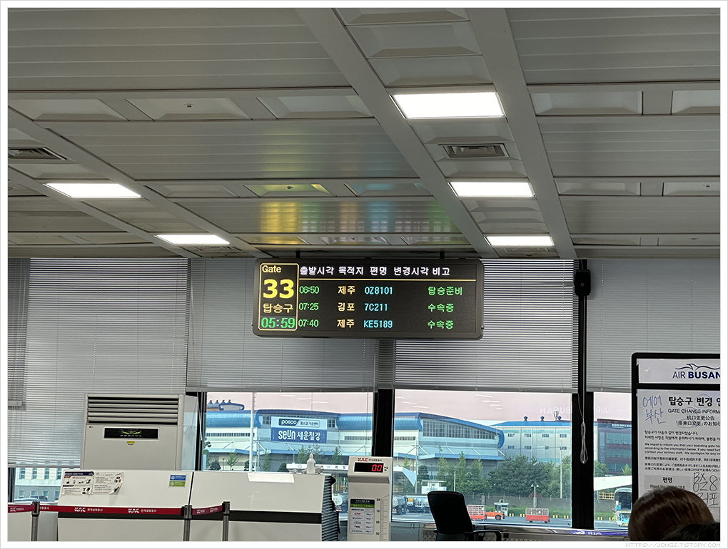 5월 제주도 여행을 했습니다. 자주 가고 싶지만 방문이 쉽지 않았는데 올해 많이 방문하게 되었습니다. 출발 비행기는 에어부산 제주행 비행기 중 가장 빠른 비행기를 타고 갑니다. 김해공항에 도착해 보안검색대를 통과해 탑승장에서 비행기를 기다립니다. 2월에는 해가 뜨지 않아 창밖이 캄캄했는데 5월이라 밖이 환합니다.