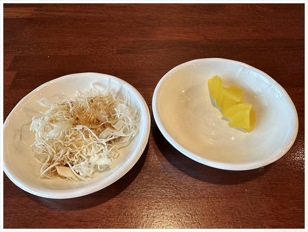 ▼ 모든 시스템이 셀프입니다. 키오스크에서 주문을 넣고 자리를 잡으면 반찬들을 셀프 코너에서 가지고 와야 합니다. 양배추 샐러드와 단무지를 가지고 왔습니다. 주문한 메뉴가 나오기를 기다리고 있는데 남자 손님 2명이 와서 단골이였는데 언제 음식점을 옮겼냐고 음식이 생각나서 다시 찾아서 왔다고 이야기 합니다.