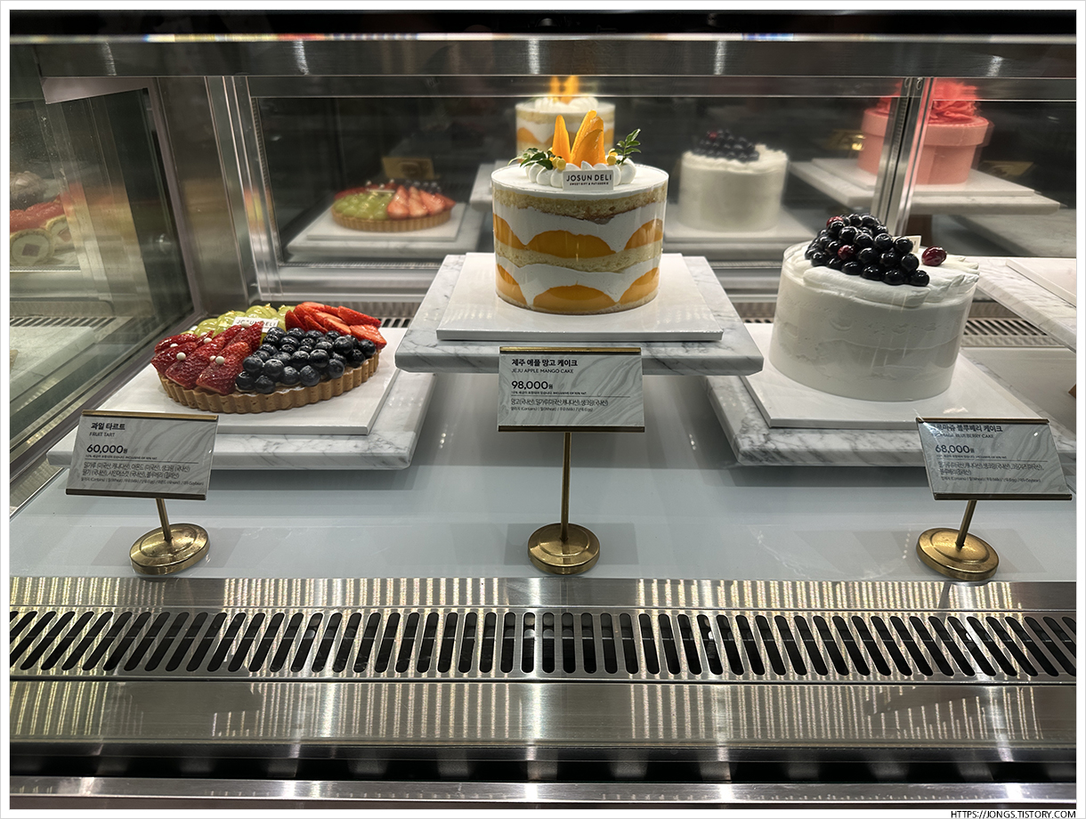 ▼ 왼쪽부터 과일 타르트(60,000원), 제주 애플 망고 케이크(98,000원), 프로마쥬 블루베리 케이크(68,000원)입니다. 케이크 디자인이 깔끔하고 예쁩니다.