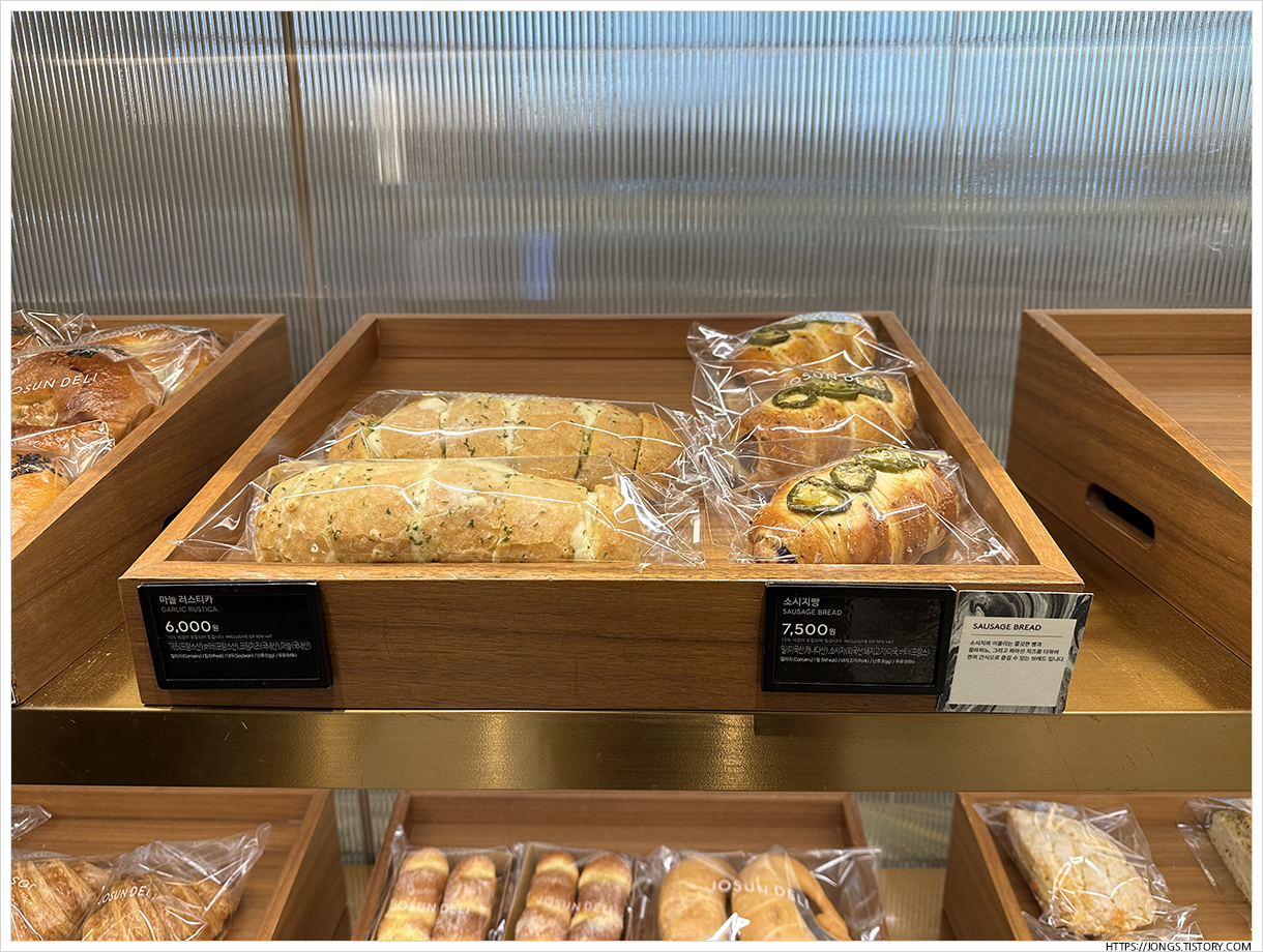 ▼ 마늘 러스티카, 소시지빵 입니다. 제가 좋아하는 소시지빵입니다. 위에 있는 것은 할라피뇨인데 약간 매우면서 소시지와 쫄깃한 빵이 정말 맛 있습니다. 그랜드 조선 부산 바로 옆에 파라다이스 호텔 부산 부티크 베이커리는 호텔 베이커리 중에 가격 부담도 덜하고 품질도 높은편인데 여기서 소시지 빵을 사서 정말 잘 먹었거든요. 그런데 어느날 부터 제품이 안 나와서 아쉬웠는데 그랜드 호텔 부산 조선델리에서 소시빵을 보고 너무 반가웠습니다.