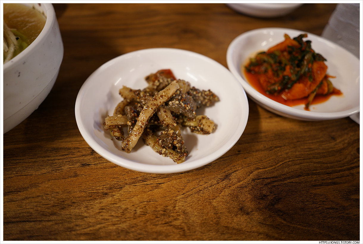 ▼ 가지와 무말랭이에 들깨로 버무린 반찬과 열무김치입니다. 가지와 무말랭이 들깨 버무림은 맵쌉한데 검은콩국수와 잘 어울리는 반찬이더군요. 직원분들이 반찬 더 먹으라고 이야기 하셔서 눈치 안 보고 반찬을 더 받을 수 있는 것도 장점입니다.