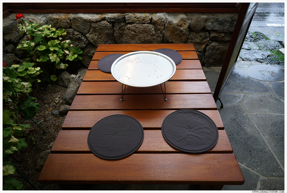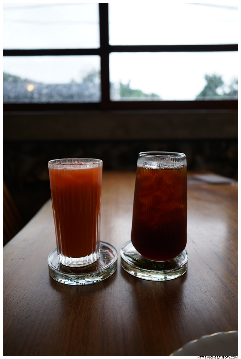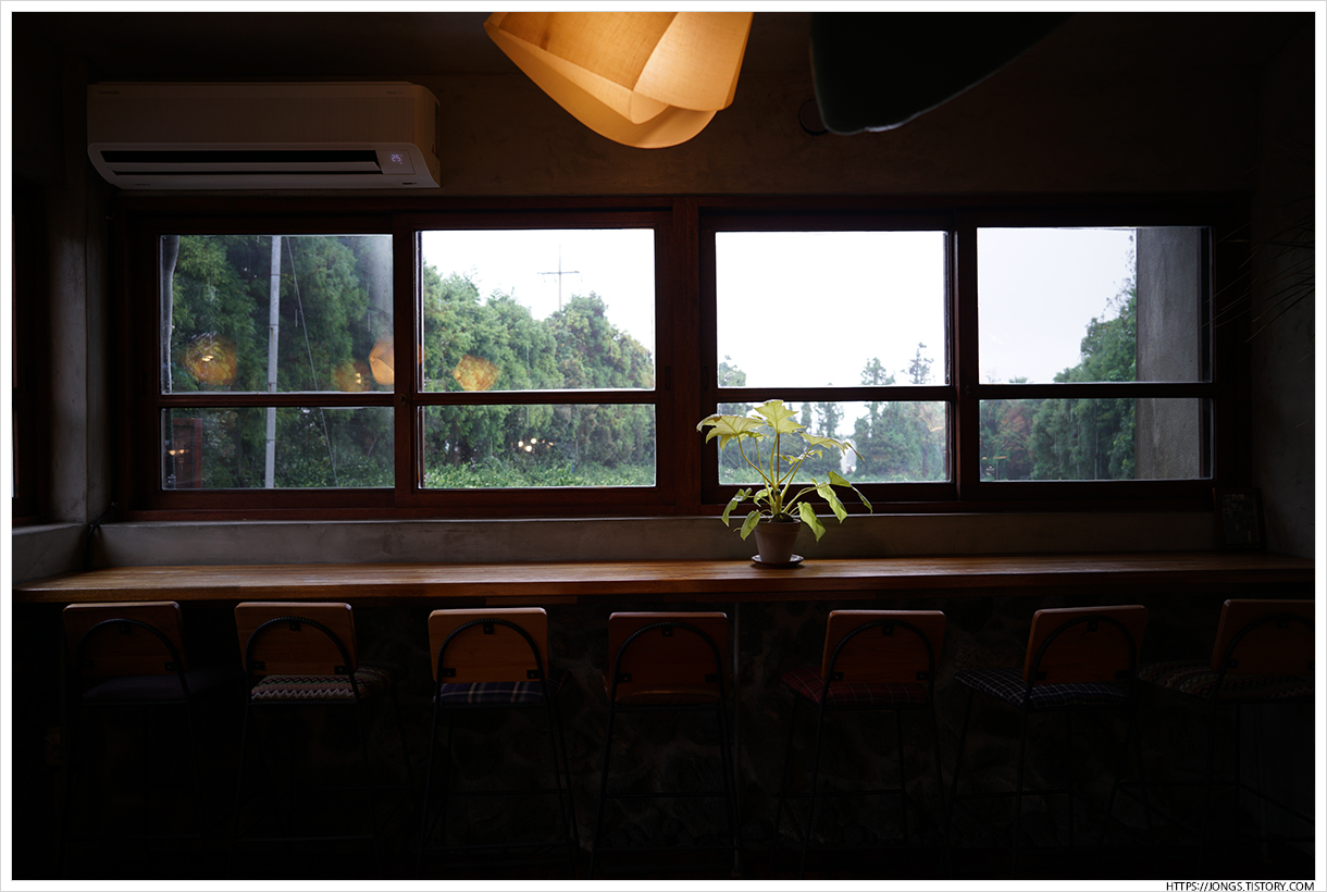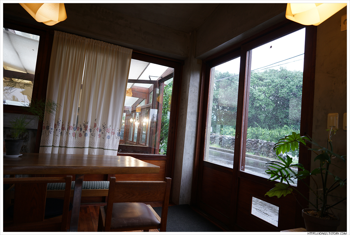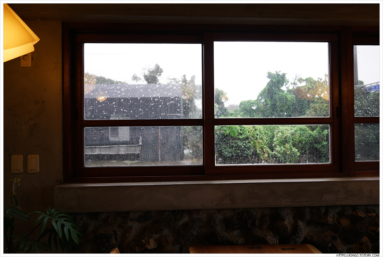 ▼ 이날을 비가 많이 내렸는데 카페 공간은 정말 아늑했습니다. 창가 밖으로 보이는 비 내는 모습이며 제주도에서 볼 수 있는 큰 나무들이 줄 서 있는 모습 등이 쉼을 가져다 주는 느낌입니다. 창밖 풍경이 예전 제주의 느낌이 많이 남아 있습니다.