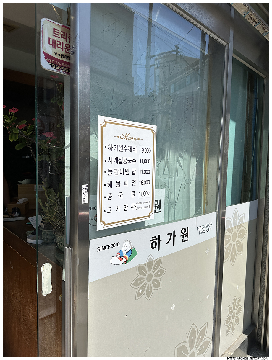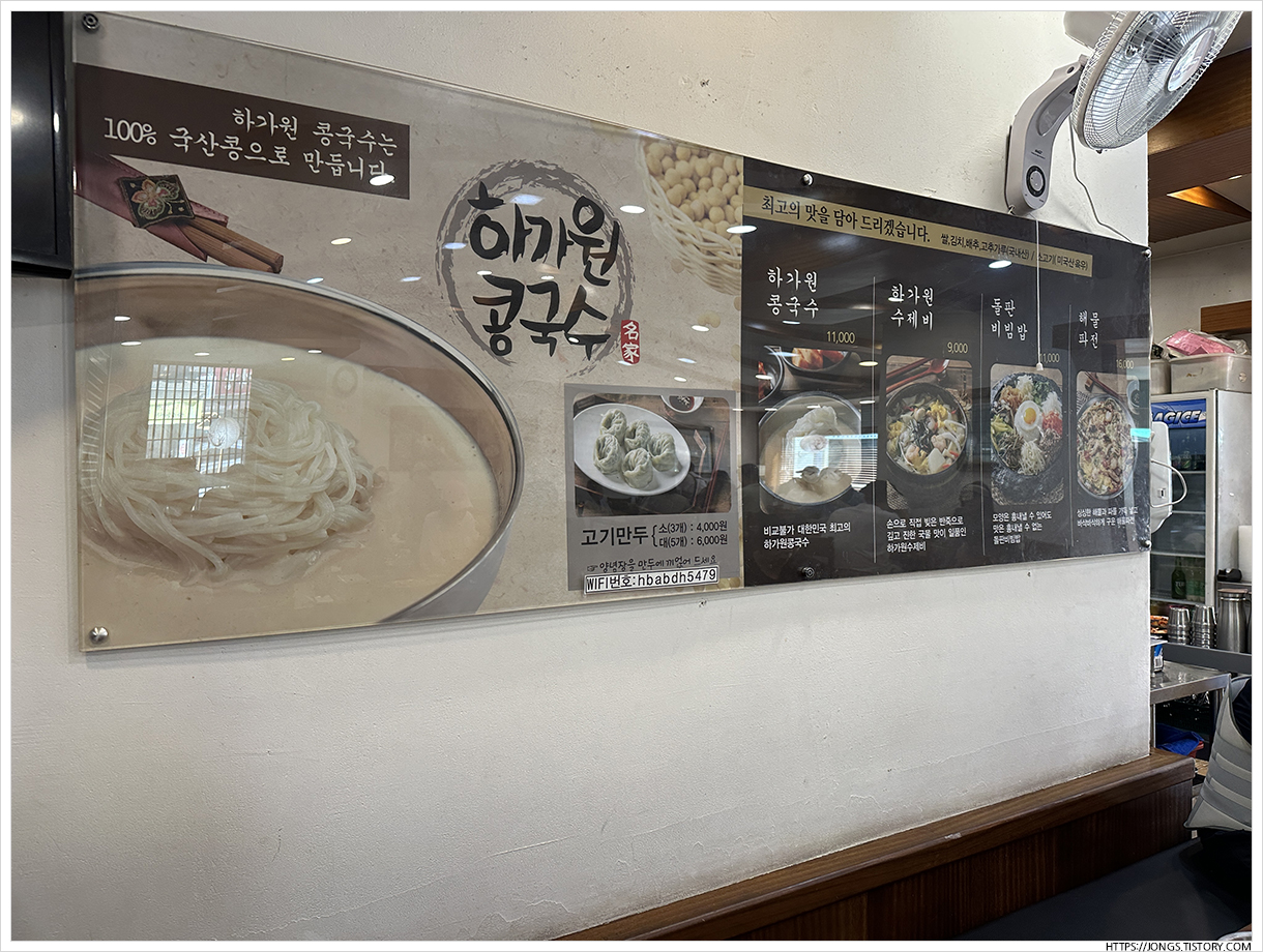 ▼ 하가원은 수제비, 콩국수, 비빔밥, 해물파전, 고기만두 같은 다양한 메뉴를 판매하고 있었습니다. 국수류만 판매하는 서가원과는 메뉴 차이가 있습니다. 그리고 서가원은 콩국수가 9,500원인데 하가원은 11,000원입니다.