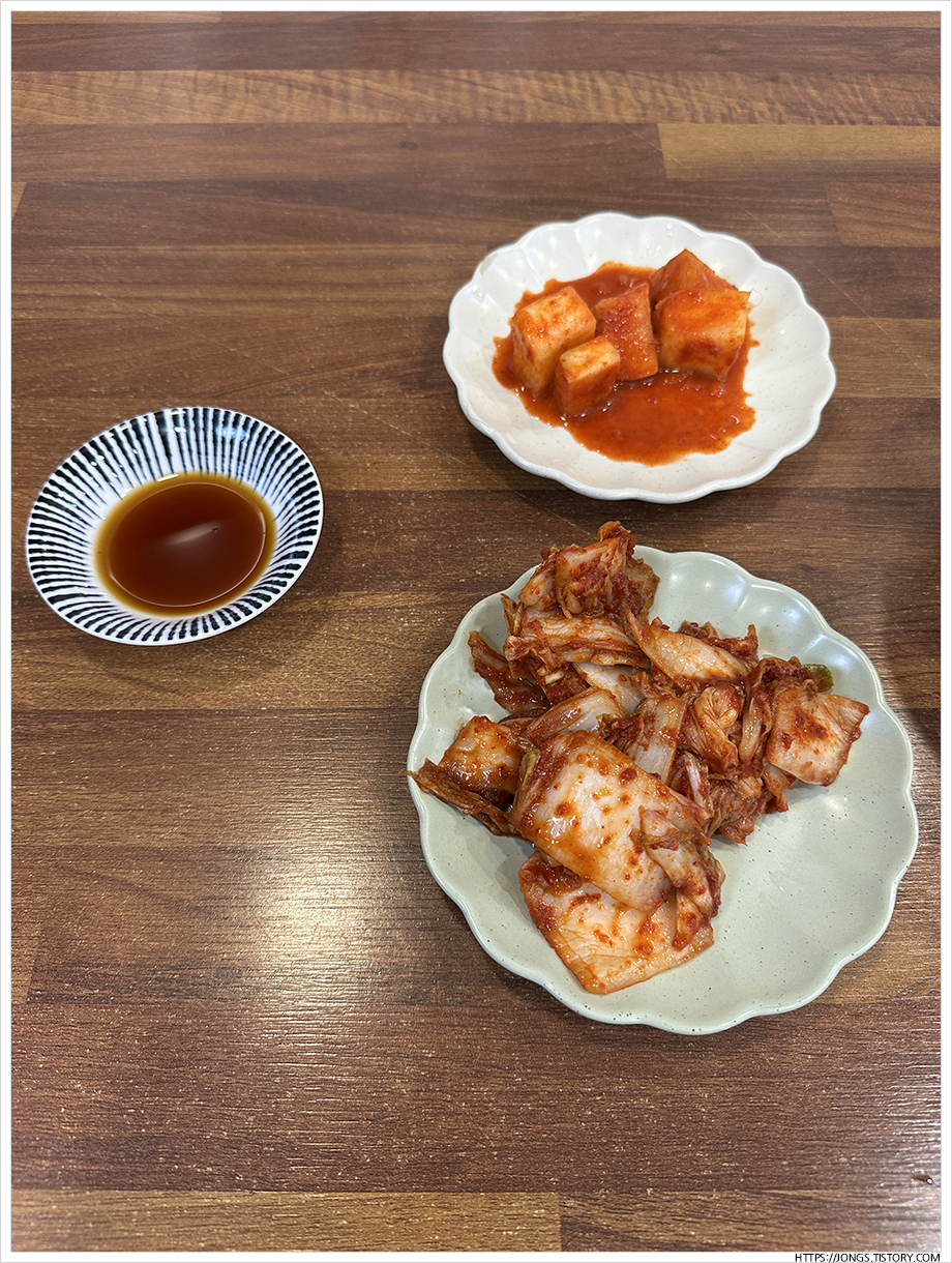 ▼ 직원분 안내 받아서 자리를 잡으면 됩니다. 거의 90% 테이블이 차 있었습니다. 자리에 앉으면 기본 반찬이 나옵니다. 깍두기, 김치가 기본 반찬입니다. 주문은 하가원 콩국수, 하가원 수제비, 고기만두로 했습니다.